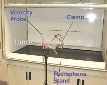 In this case the velocity in the front of the fume hood is measured using an anemometer at 6 different locations with 18 inch sash opening. The average reading as per the norms should confirm to 100 FPM