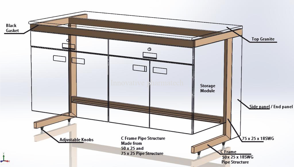 C-frame Lab Furniture System are the modern lab furniture architecture. Based on a cantilevered design, C-frame systems do not need legs for support. Innovative inc from offers you a wide range of C-Frame systems for every need. innovative inc C-Frame systems are highly flexible and adaptable to changing demands of the lab. They are relatively easy to shift and allow for easy portability of the under bench cabinets. Innovative inc also offers you a high load bearing capacity. Additionally, they also offer you easy access to the rear ducts, so that utility line maintenance is simple and stress free. The Innovative inc range has C-frame systems for both standing (900 mm) and sitting height (750 mm).