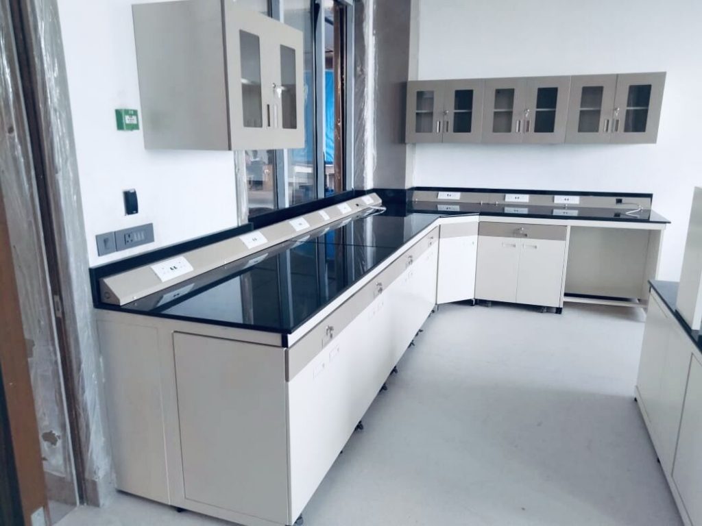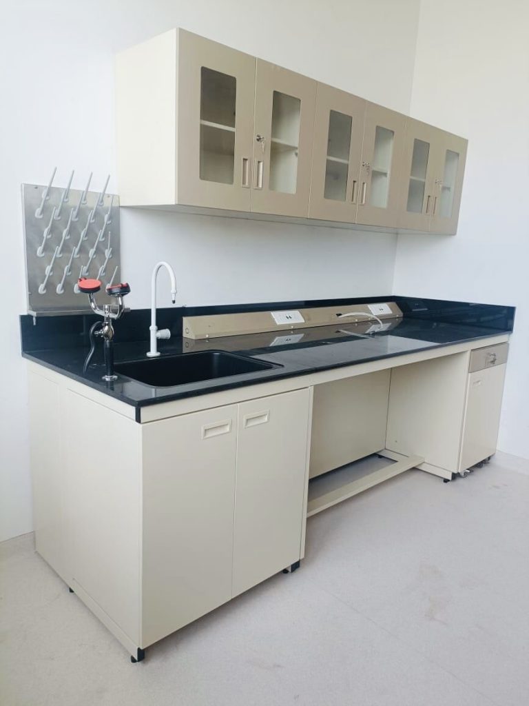 The Aluminum flush type handles without joints are resistant to chemicals and easy to clean. Our suspended cabinets are fastened to the service spine or wall without a visible gap.